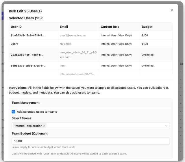 LiteLLM AI Gateway (Proxy)Admin UIBulk Edit UsersOn this pageBulk Edit Users Assign existing users to a default team and default model access. Usage​ 1. Select the users you want to edit​ 2. Select the team you want to assign to the users​ 3. Click the bulk edit button​